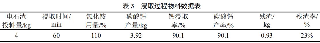 中试所用电石渣中氢氧化钙含量为 85.17%,水分含量忽略不计,浸取温度为常温,搅拌速度为 300 r/h, 浸取过程物料数据如表 3 所示。